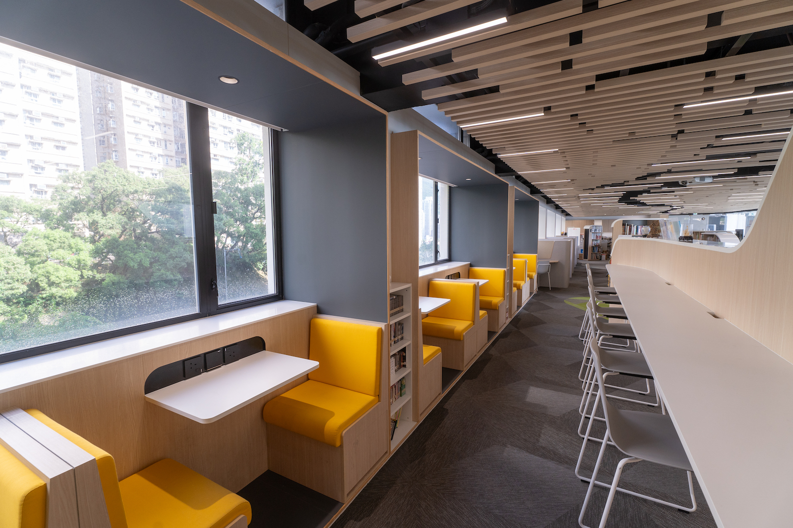 學習共享空間位於本校1樓。老師上課時能因應活動需要合併課室,促進同學和老師之間的交流,提升同學的學習效能。