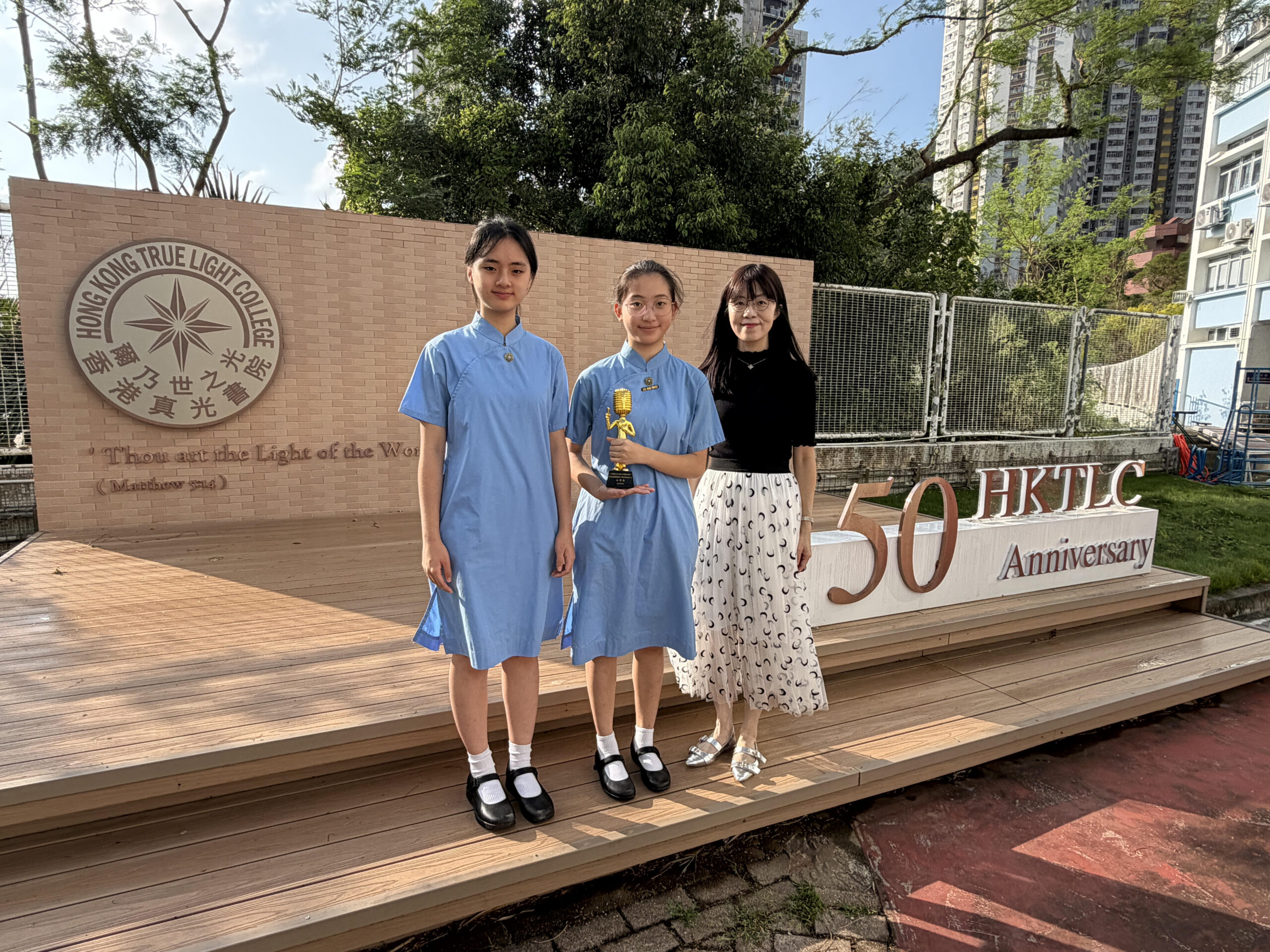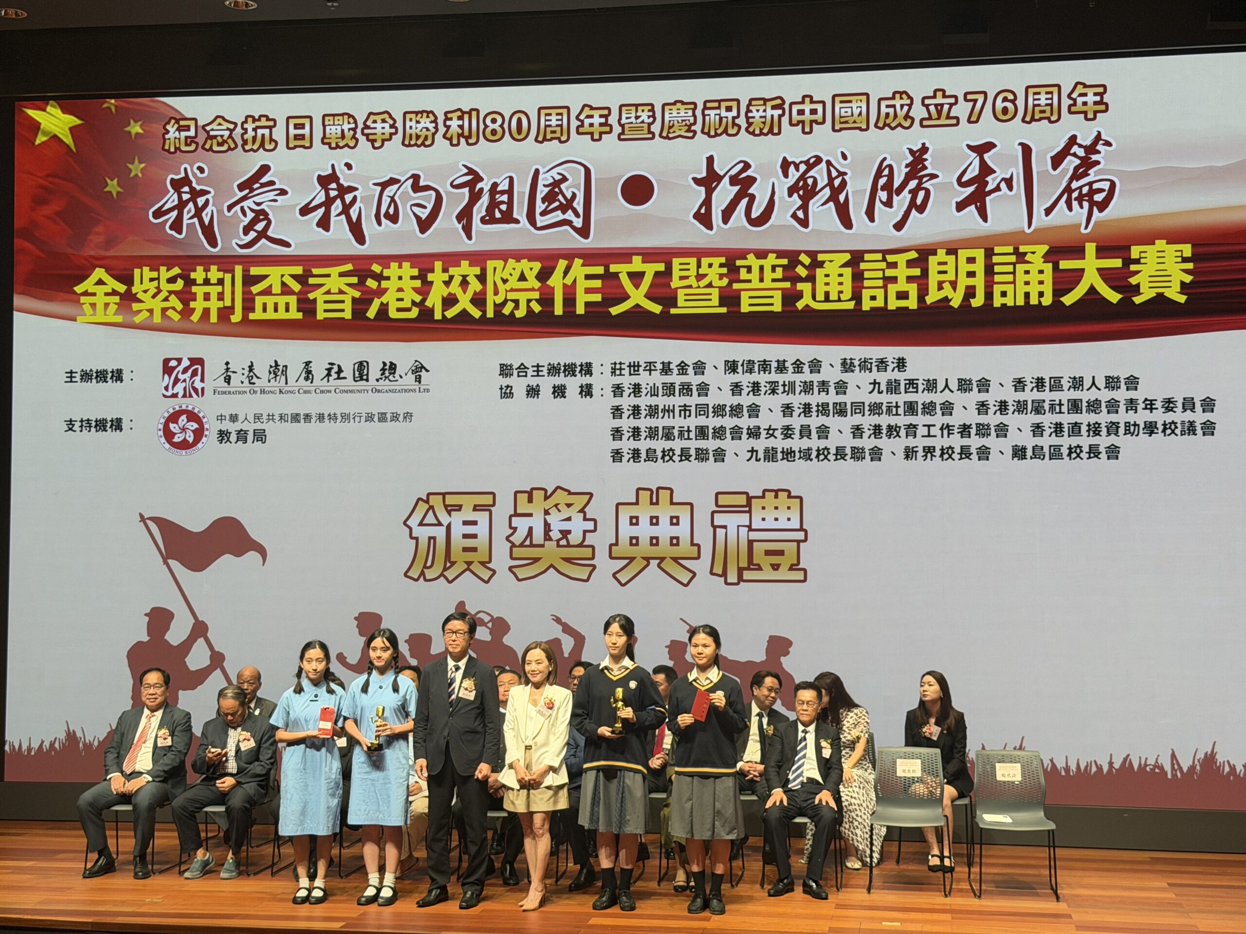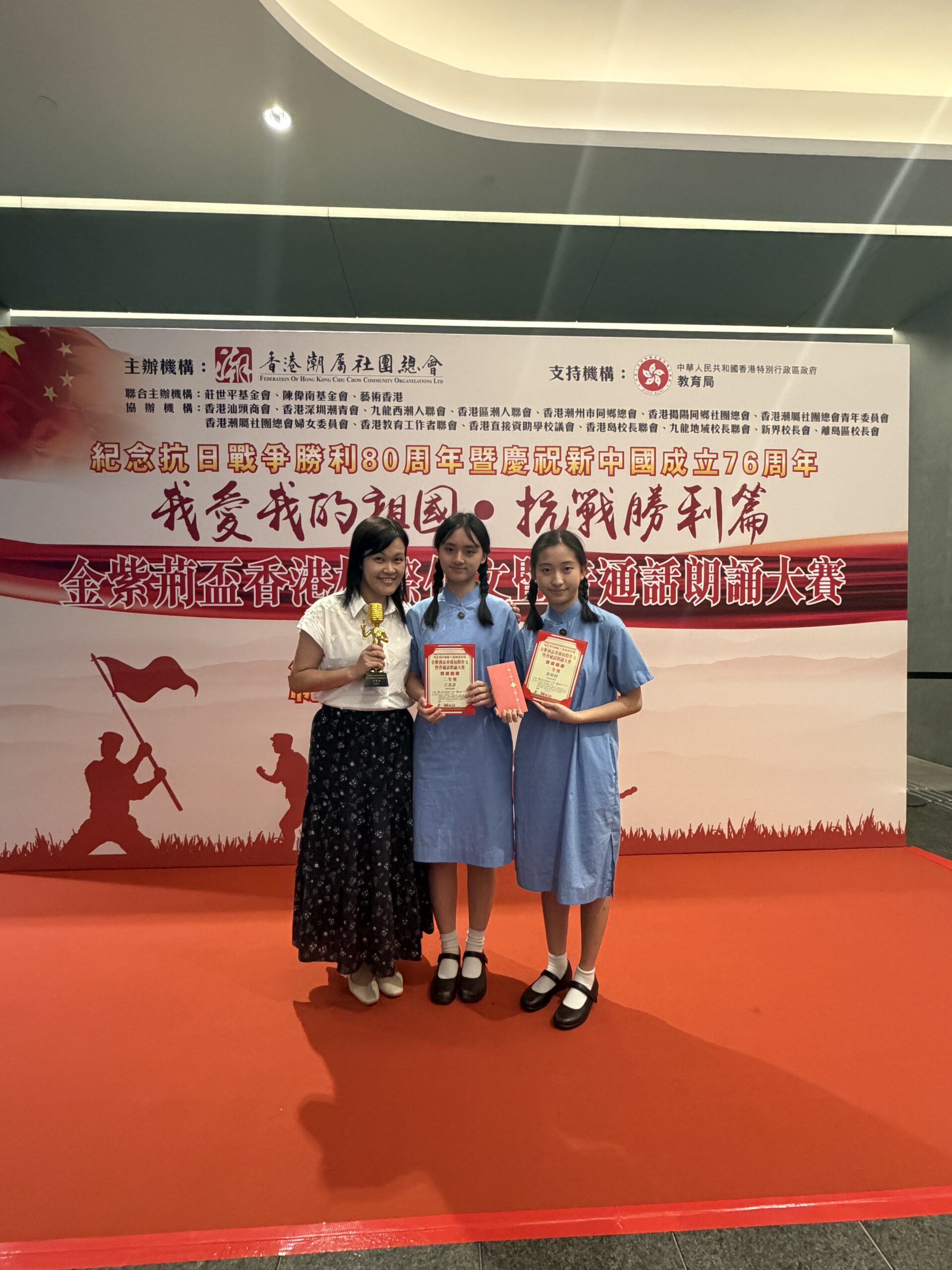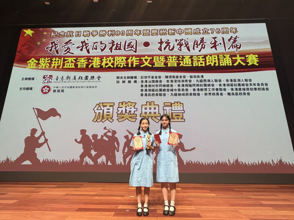 為提升學生的作文及朗誦水平,本校普通話科鼓勵同學參加由教育局支持的「我愛我的祖國‧抗戰勝利篇」金紫荊盃香港校際作文暨普通話朗誦大賽。本校中五級許婷婷及王采彥同學成功擠身於2025年9月21日舉行的複賽,更榮獲二等獎,獲學校獎盃一座、學生獎狀及港幣800元獎金,並於2025年10月5日出席頒獎典禮。