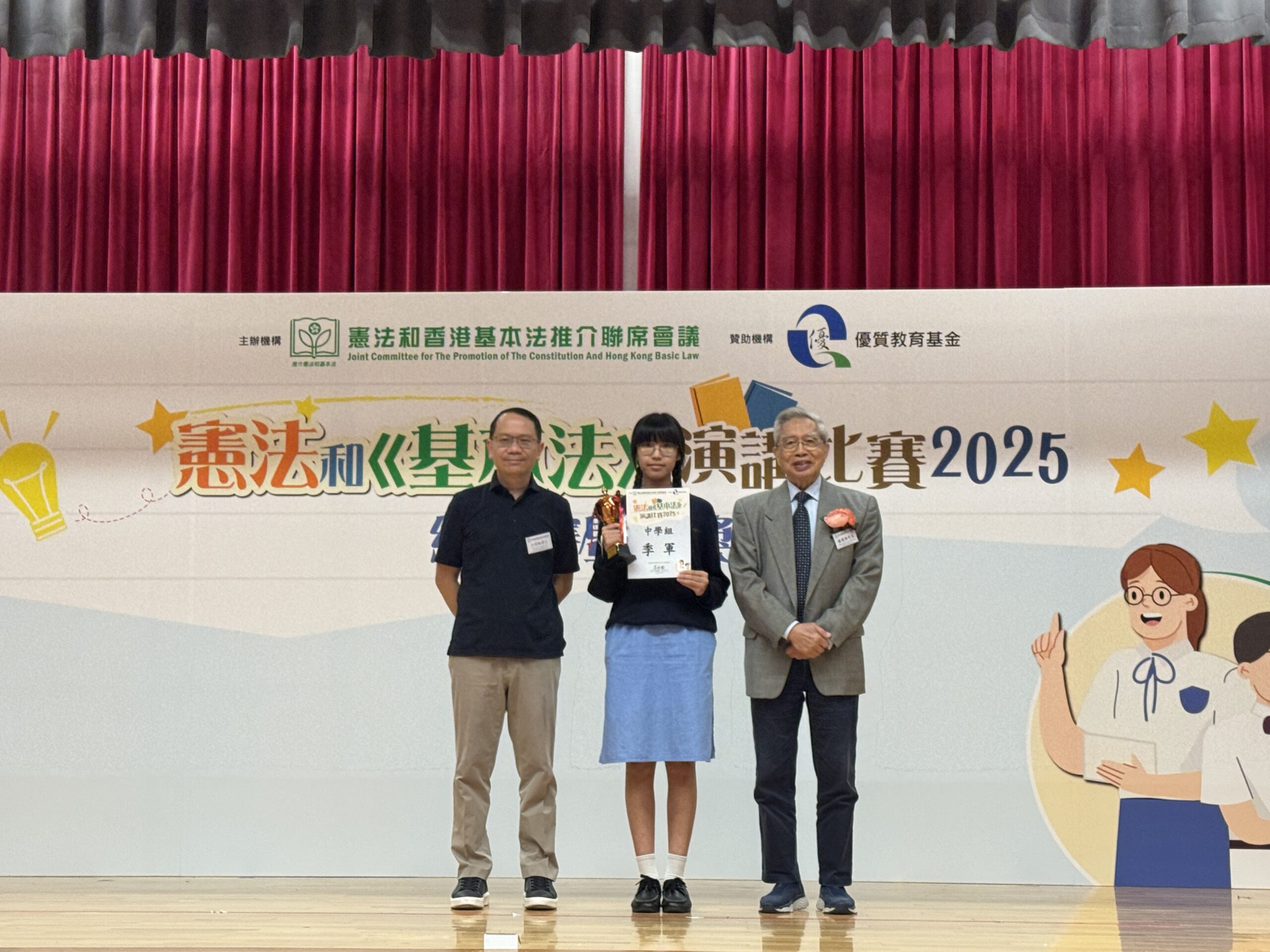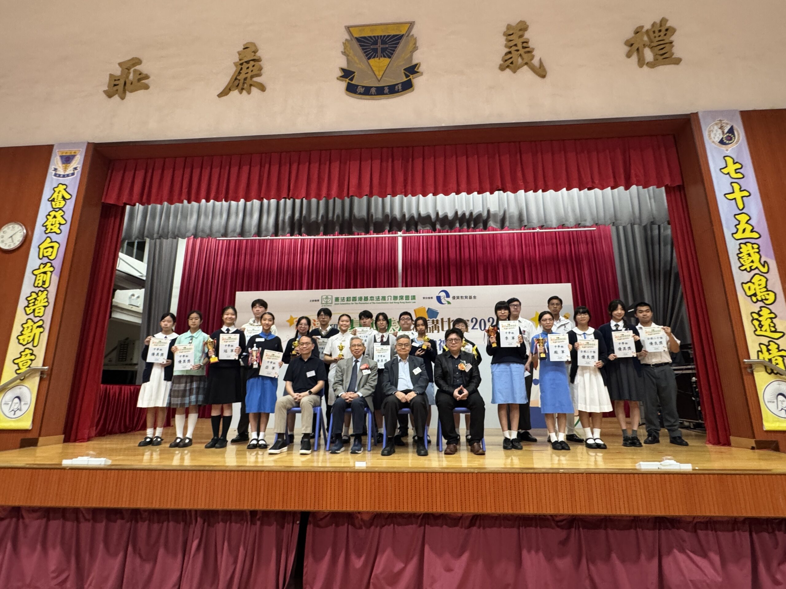本校中華文化及國民教育組邀請了5位學生參加「憲法和《基本法》演講比賽2025」。其中,中六周曼喬同學及中四田梓瀅同學入圍全港二十強,並於2025年11月15日下午與其他學校如皇仁書院 、浸信會呂明才中學、協恩中學、香港培道中學及旅港開平商會中學等競逐獎項。比賽設有冠、亞、季、殿、優異獎及優良獎,競爭非常激烈,兩位學生表現仍然非常優秀,憑藉穩定的發揮,田同學和周同學分別獲得季軍及優異獎,為校爭光。
