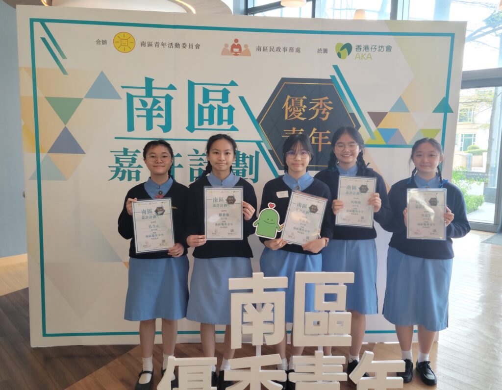 「優秀青年嘉許計劃」,旨在藉著嘉許優秀的青年人,鼓勵青年為個人發展訂下目標,並積極參與建設社區及投入參與社會服務,為其他青年人樹立榜樣。此外,「優秀青年活動嘉許計劃」表揚具創意、有深度、受青年人歡迎的地區青年活動,以鼓勵地區舉辦更多高質素、有效推動青年發展的活動。南區傑出少年(初中組): 2C 林啟晴南區優秀青年(高中組): 6E 鄺惠愉南區優秀青年(高中組): 6B 盧梓桐南區優秀青年(高中組): 5C 李嘉芸南區優秀青年(初中組): 3A 馮順琳南區優秀青年(初中組): 3A 孔令心