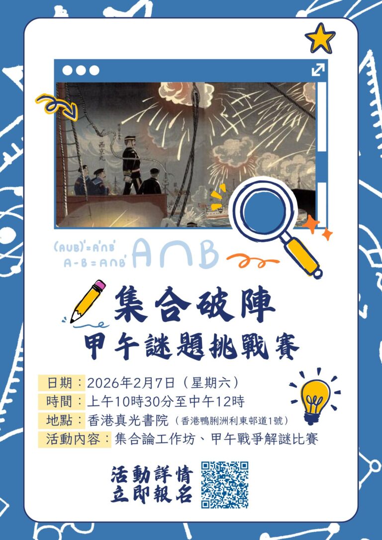 本校將於 2026年2月7日(星期六)上午十時半至中午十二時舉辦一項結合數學思維與歷史文化的特色活動—「集合破陣:甲午謎題挑戰賽」,誠邀對數學、中國歷史及中華文化有興趣的學生踴躍參與。