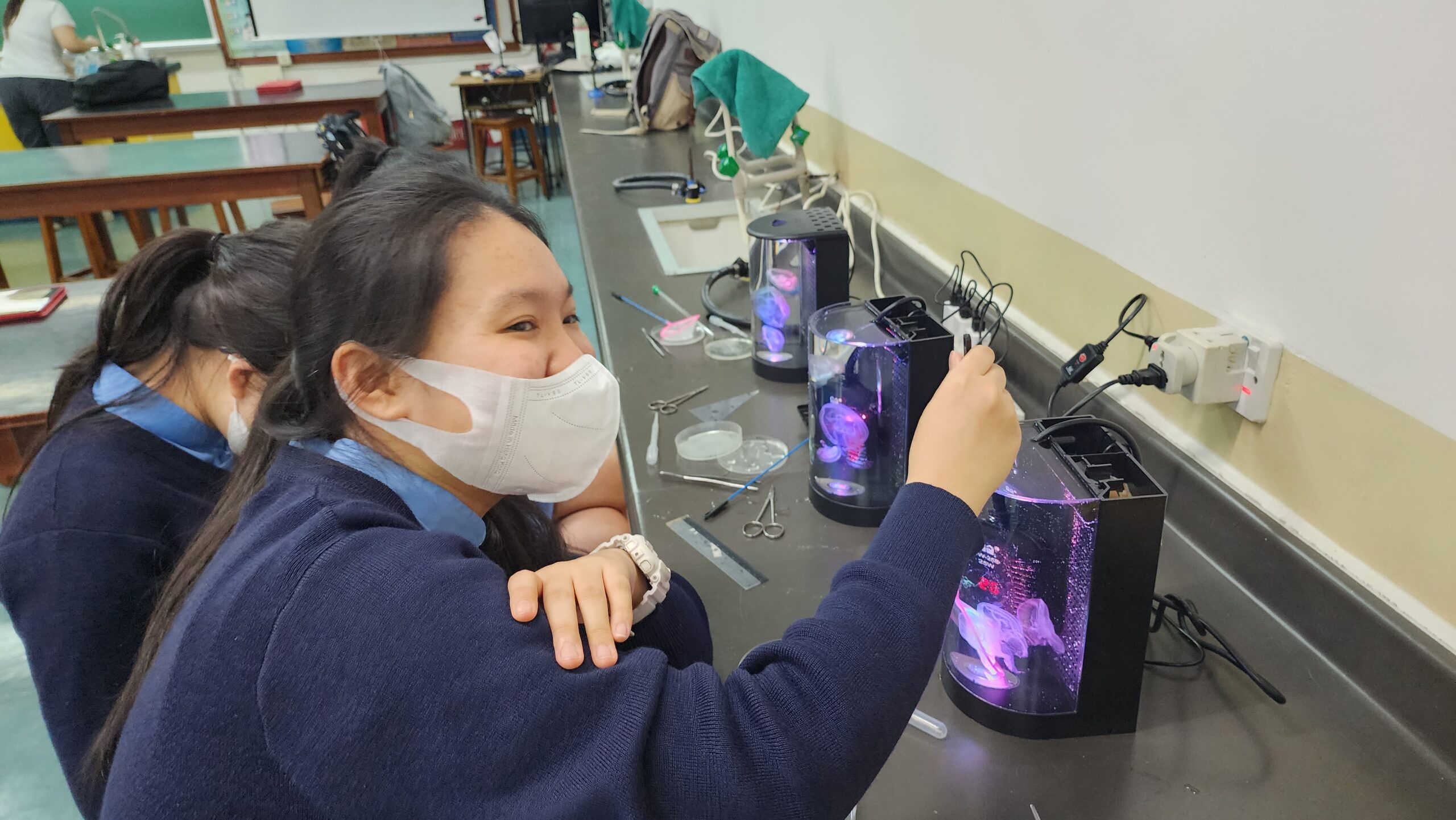 於4月10日中四級及中五級DTP生物科學生在中大團隊的指導下進行科學探究,研究不同環境條件如何影響水母的再生能力。在學校持續量度生物,收集數據,之後以數據分析結果。